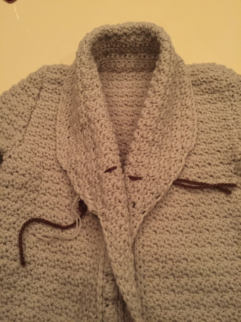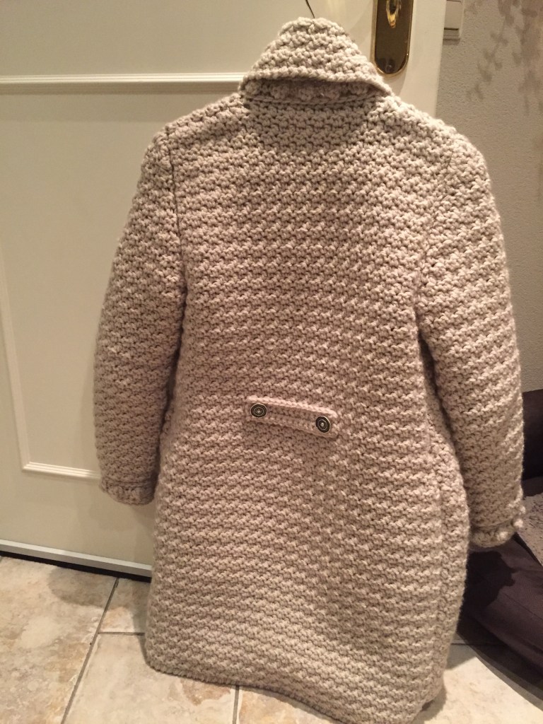 Ook de knopen kunnen op voorkant van de jas gezet worden. Dat heb ik ook gewoon met een dubbele draad gedaan. Een twee omslagen knoop erin, dan de draden door het haakwerk naar de binnenkant steken met een borduurnaald en aan de binnenkant ook een knoop leggen en daarna met alle draden samen een knoop maken en stevig aan trekken. Afknippen klaar!