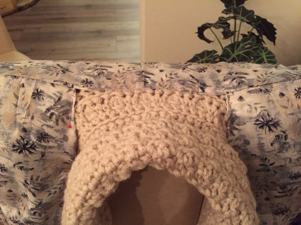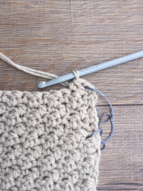Nu gaan we de kraag eraan haken. Geef met 2 contrast draden aan waar je wilt dat de kraag begint. Je maakt een begin met een dubbele draad 6 steken lager dan waar je contrast draad zit. Ik heb op onderstaande foto al een klein stukje gehaakt maar waar mijn haaknaald zit daar ben ik begonnen.