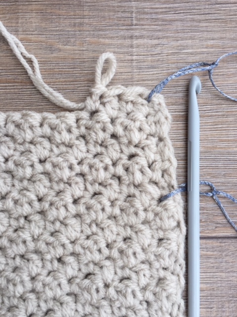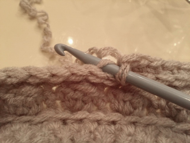 1e toer: na de keer losse(n) de volgende 2 steken samen haken (22 steken)