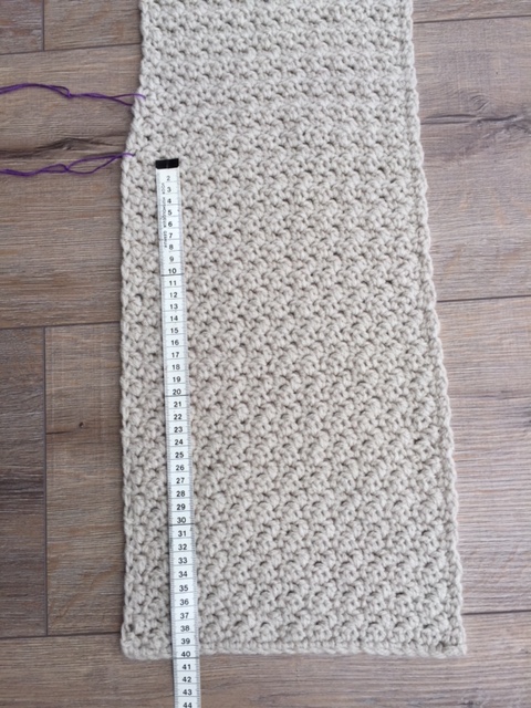 Vanaf toer 8 haken volgens het patroon en elke 7 cm aan beide kanten 1 steek meerderen aan het begin van de toer. (dit meerderen doe je dus over 2 toeren, heen 1 vermeerdering aan de ene kant en terug 1 vermeerdering aan de andere kant) Dus meerderen bij een hoogte van 7, 13, 19, 25, 31, 37 en 43 cm.
