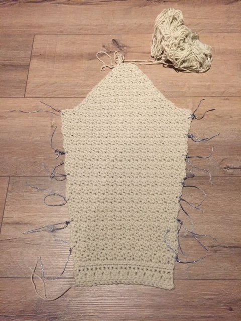 RUGPAND: Maak een sliert van 49 lossen plus 1 keer losse. In patroon haken zoals het voorpand met aan 2 kanten de heup minderingen en aan 2 kanten de niet gehaakte steken voor het armsgat. (als je steken niet haakt kan je op de onderliggende steken slip stitches maken om bij je beginplek te komen)