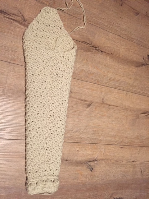 ZAKKEN: maak een sliert van 16 lossen en haak volgens het patroon. Begin met een stokje in de 2e losse. Bij 15 cm hoogte haak je het patroon van de eerste 7 toeren van de mouw. Daarna is de zak klaar. Maak er 2. Mijn zakken zijn 16 cm breed en 19 cm hoog. Kies een geschikt plekje op de voor panden en zet de zakken vast met een dubbel draad.