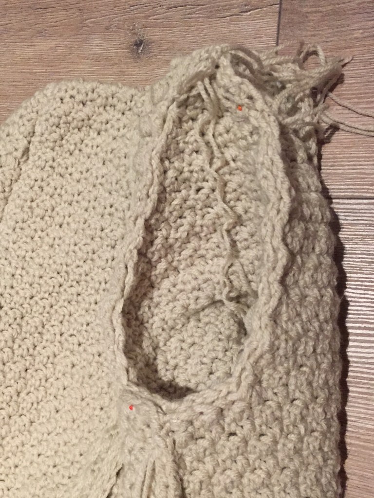 3e toer: de laatste 4 steken niet haken voor het armsgat. Dit zit dus aan de tegenovergestelde kant dan de hals minderingen!