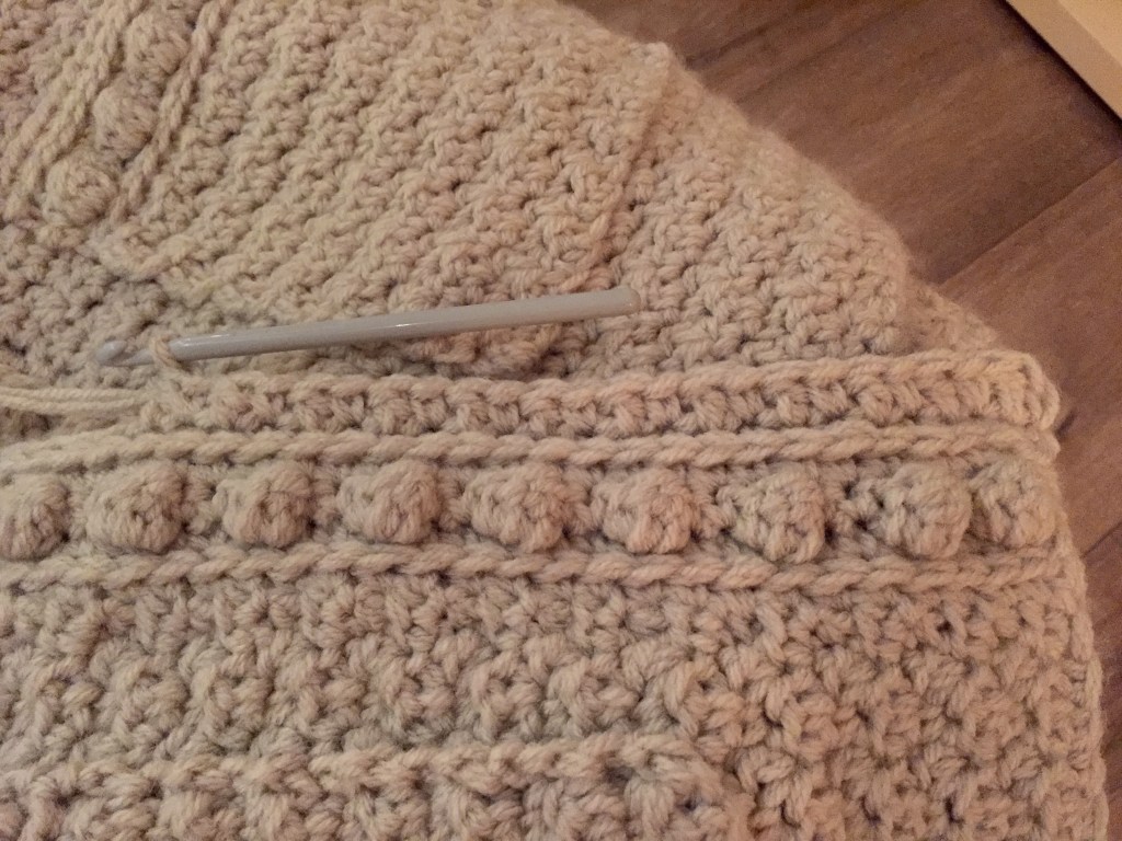 4e toer: 1 losse, *2 vasten, 3 stokjes in 1 steek samen haken, 2 vasten*, ** herhalen, eindigen met 1 vaste. Dit is de toer waarin de bobbeltjes ontstaan in de boord