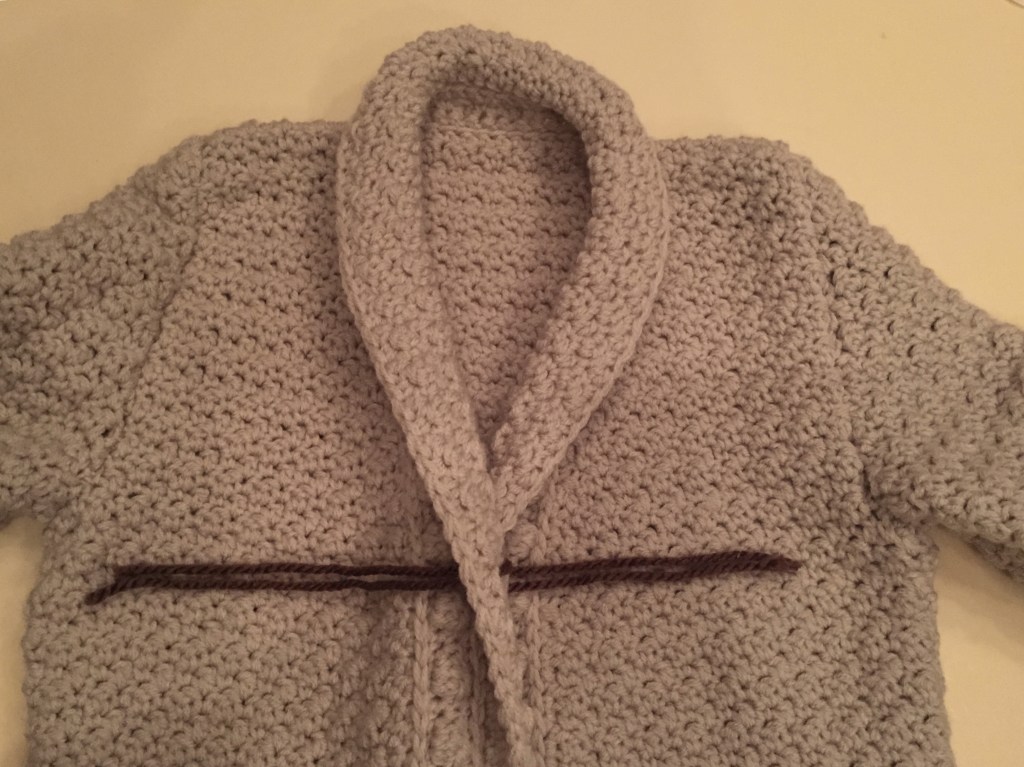 Voor een mooie afwerking haak ik langs de hele jas / coatigan een kreeften steek. Een kreeften steek is een achteruit gehaakte vaste dus begin hiervoor onderaan het linker voorpand. Met een dubbel draad een lus ophalen en omhoog haken langs het voorpand, langs de hals / kraag, langs het andere voorpand naar beneden en langs de hele onderkant van de jas / coatigan. Als het goed is kom je dan weer uit waar je bent begonnen.