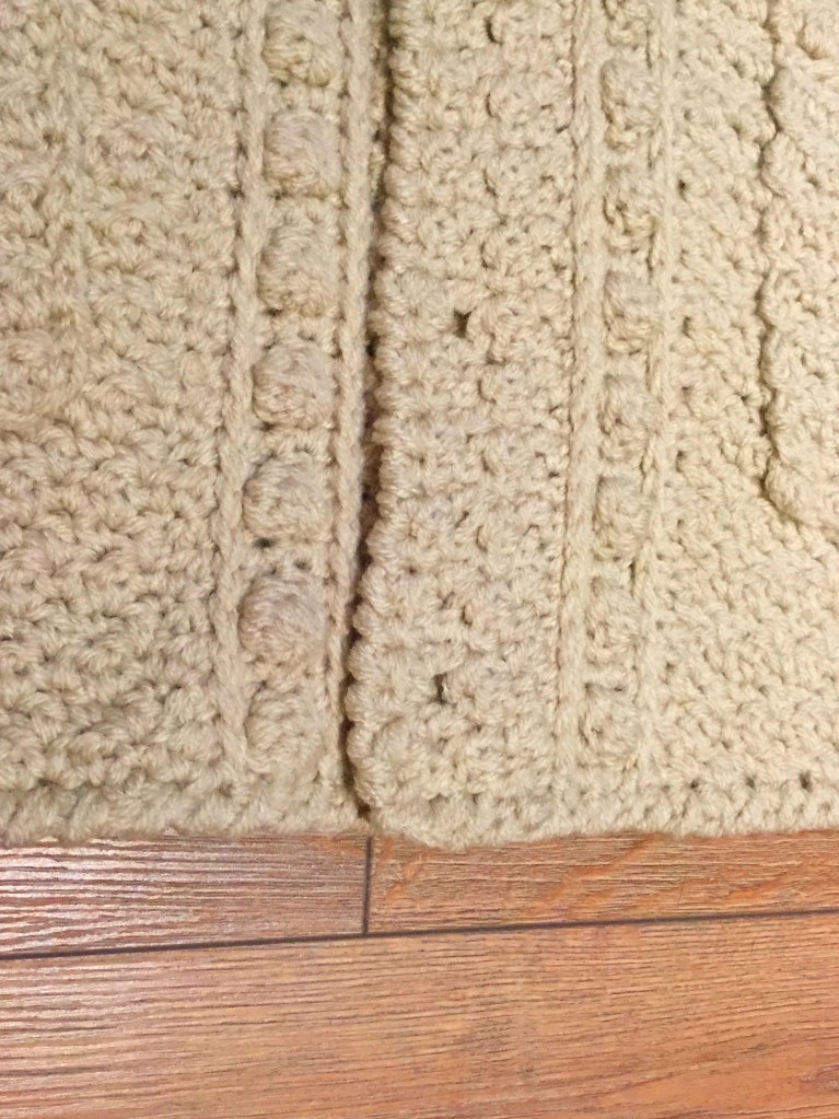 Nu het vervolg voor de COATIGAN: We gaan verder haken langs de voorpanden en de hals om een mooie sluiting met knoopsgaten en een warme kraag te maken. We beginnen weer onderaan het rechter voorpand. Haak 4 toeren in patroon (1 vaste, 1 stokje). In de 3e toer gaan we langs 1 van de voorpanden (kies links of rechts) verdeeld 6 knoopsgaten haken door 1 steek over te slaan. Zorg dat de steek die je overslaat een vaste zou moeten zijn. Je haakt dus een stokje, slaat dan een steek over (in de voorgaande toer is dat een stokje) en haakt weer een stokje (boven een vaste van de voorgaande toer). In de 4e toer haak je tussen deze 2 stokjes een stokje, op de stokjes zelf komt natuurlijk een vast (volgens het patroon). Zo krijg je mooie en niet te grootte knoopsgaten. Ik heb tussen elk knoopsgat 9 steken zitten. Aan het einde van de 4e toer de draad afknippen.