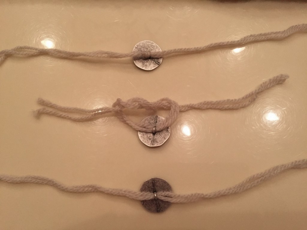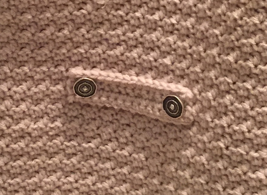 Voor op de achterkant van de jas maak ik nog een bandje welke te hoogte van de taille wordt vast gezet. Deze heeft geen functie maar staat gewoon mooi. Ik zet daar ook twee knopen links en rechts op. Voor het bandje haak ik een sliert van 16 lossen en daarop haak ik 4 toeren met 15 vasten. Je begint dus in de 2e losse.