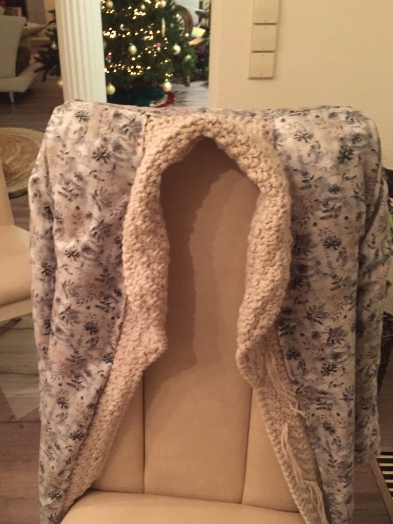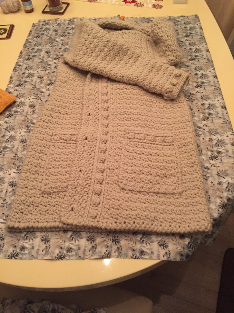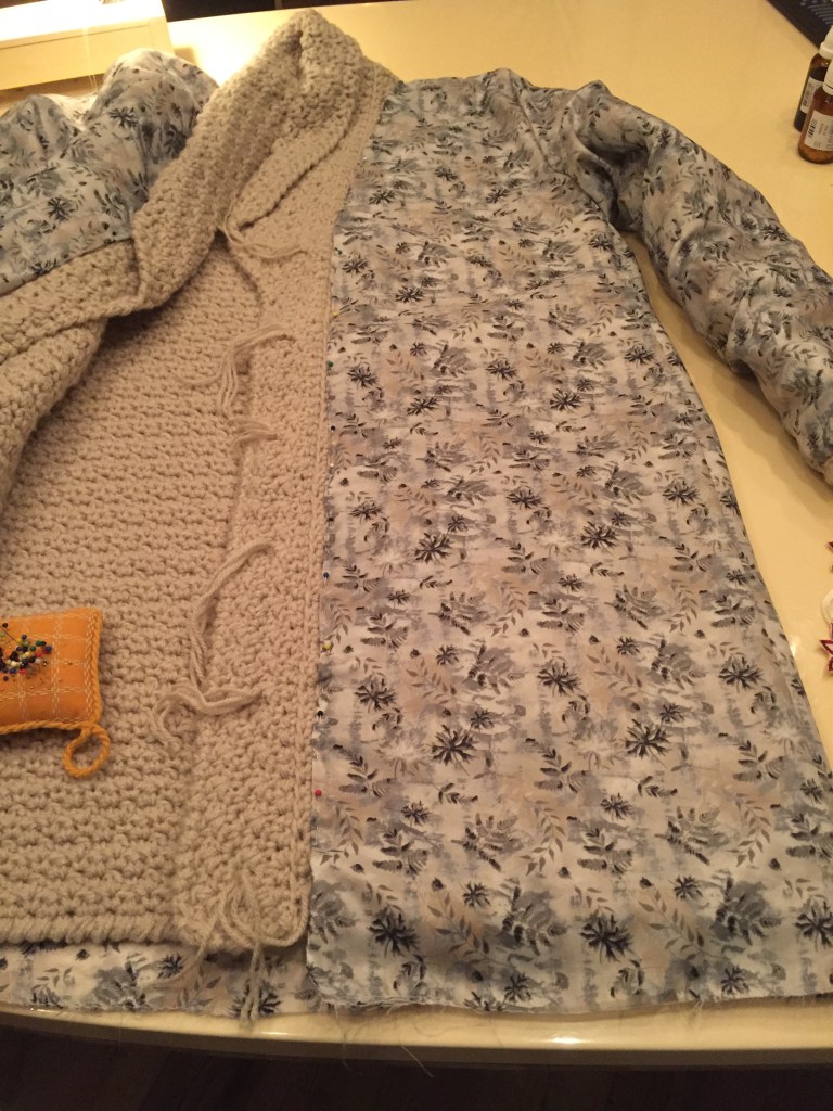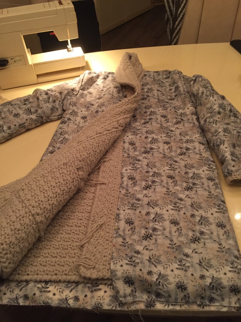 Het handigste is dus als je eerst alle gehaakte panden op de voeringstof legt en deze ruim uitknipt. Daarna past alle panden aan elkaar zetten en ook de voering stof delen aan elkaar naaien. Dan de jas binnenste buiten keren en de voering “aantrekken” om de jas heen. Dan de voering vastzetten aan het gehaakte deel.