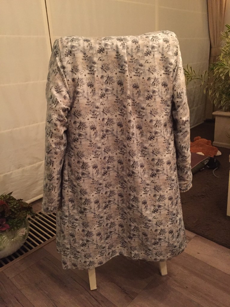Ik heb mooie voering stof gekocht. Om een voering in een jas te zetten maak je eigenlijk van die voering dezelfde jas maar dan een maatje groter. De voering en de jas zet je met de verkeerde kanten tegen elkaar vast. Ik heb dit met de hand gedaan met een klein steekje met een dubbel draad in de kleur van mijn coatigan. Bij het achterpand van de voering heb ik in het midden een plooi gelegd om te voorkomen dat de voering gaat trekken. Haak werkt rekt wel mee maar voering stof niet. Van de mouw heb ik op patroon papier een tekening gemaakt voordat ik de mouwen in de jas heb gezet. Hieronder wat foto’s van hoe ik de voering heb gemaakt.