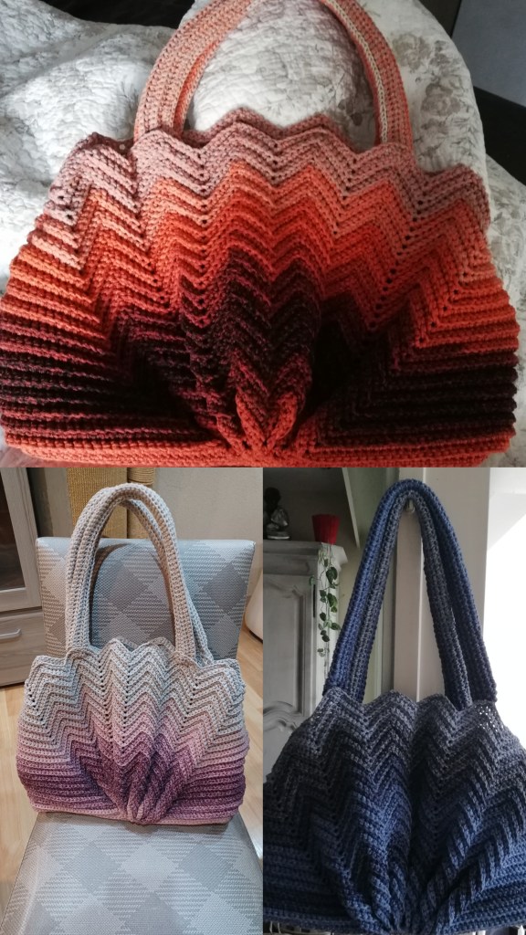 Ik heb een knot Washi van Katia gebruiken en haaknaald no 5,5. Het is heel moeilijk te beschrijven hoe je deze handvatten haakt daarom verwijs ik even naar een filmpje op Youtube