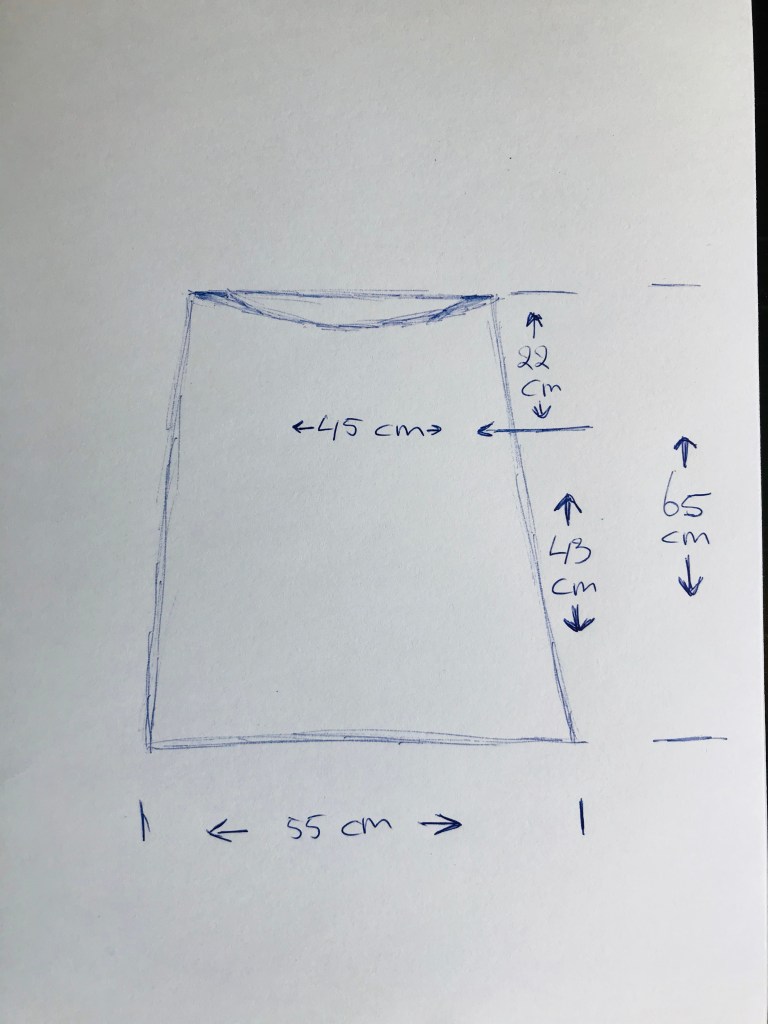 Ik heb eerst een proeflapje gemaakt en ik had 20 steken op 10 cm in de breedte. Daarna heb ik een tekening gemaakt van hoe ik mijn top wilde hebben. Ik wilde de onderkant breeder dan de bovenkant, omdat ik mijn buikje wil verdoezelen. Normaal maak ik mijn panden 50 cm breed, maar nu ben ik begonnen met 55 cm. Als ik 55 cm breedte wil hebben aan de onderkant dan begin ik dus met 110 steken op te zetten. Want even rekenen: 10 cm is bij mij 20 steken, dus 55 cm is 5,5 x 20 = 110 steken. Dus maak een proeflapje en reken uit hoeveel steken jij op moet zetten voor jou gewenste breedte maat (aan de onderkant).