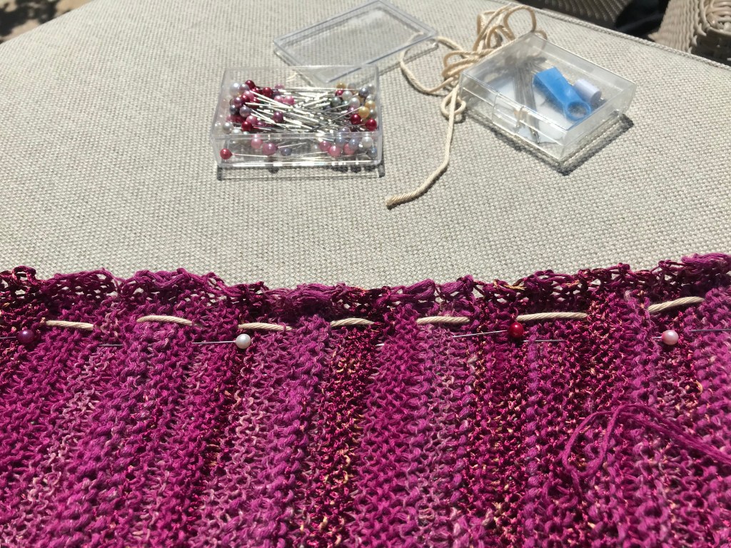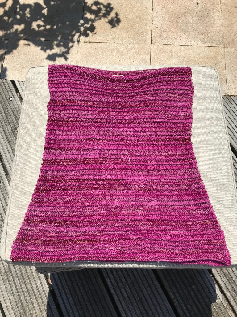 Omdat dit rekbare werk heel moeilijk te meten is, heb ik, toen ik het rugpand bijna klaar had, de panden even met een dikke draad luchtig aan elkaar gestikt. Ik heb het werk eerst met spelden hier en daar vastgezet en toen met de dikke draad een grote stiksteek gemaakt langs de zij naden. (Dit haal je er later ook heel gemakkelijk weer uit.) Dan pak je het werk aan de onderkanten vast en houd je het ondersteboven. Dan voorzichtig plat neerleggen op de bank of zo (vlakke ondergrond). Zo kan je het beste beoordelen of je panden even lang zijn voordat je gaat afkanten. Ik heb het 2 keer uit moeten halen omdat mijn pand niet lang genoeg was dus ik wil je aanraden om dit zeker even te doen. Het bespaart je een hoop werk.