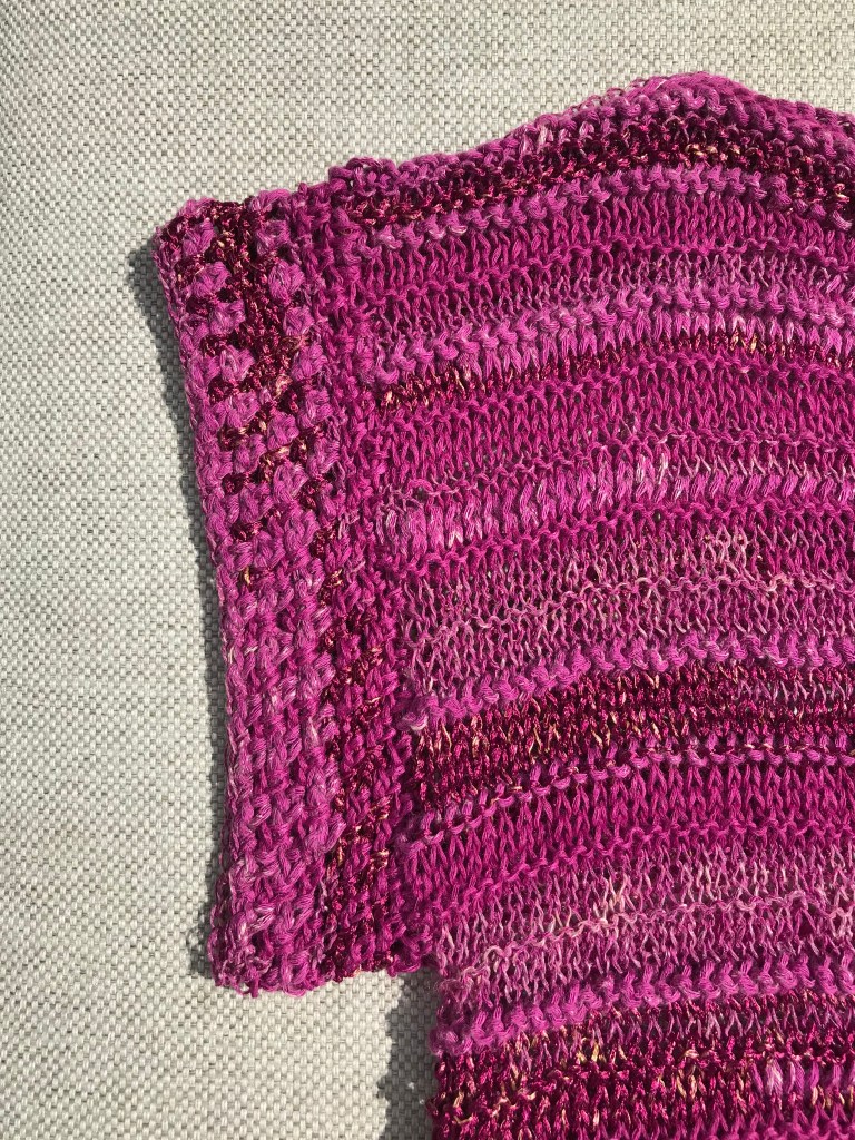 Je zou de top nu zo kunnen laten, maar ik heb er nog een paar korte mouwtjes aangehaakt. Ik heb met haaknaald no. 5 langs de mouw opening vasten gehaakt met tussen elke vaste een losse. Dus *1 vaste, 1 losse, een steek overslaan*, ** dit herhalen.