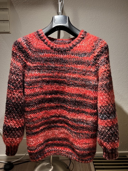 Als het goed is is je trui nu klaar :). Nog even alle draadjes wegwerken en je kunt hem aan! 🙂 Als je geen glitter draadje hebt toegevoegd in de donkere delen van de draad ben je heel snel klaar :). Dat is het voordeel van het top down breien.