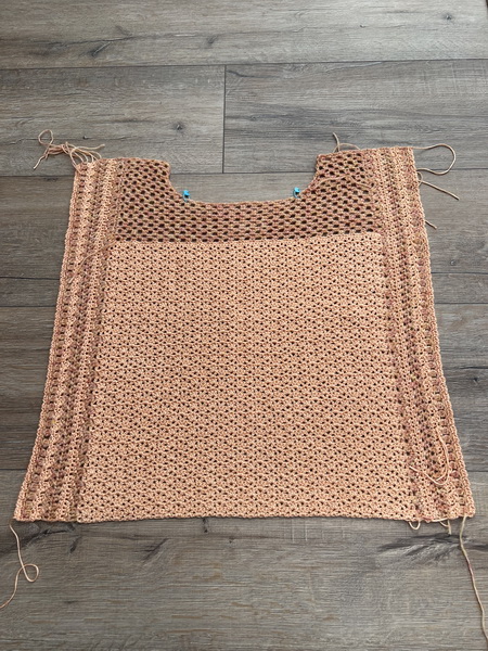 - Toer 1 en 2 steeds herhalen. Ook dit is een verspringend patroon. Bij 16 cm hoogte van deel B (totaal 58 cm) verder haken langs de zijkant van het pand, deel C. Het is handig om deel B te eindigen met een teruggaande toer.