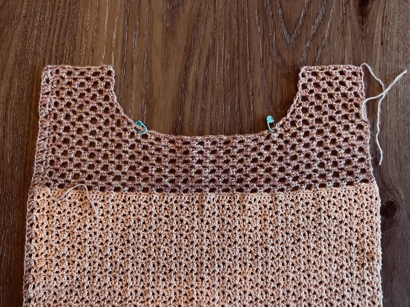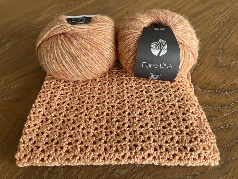 Hals: Langs de hals heb ik met Puno Due 2 toeren om en om 1 vaste, 1 losse gehaakt. Telkens de losse boven de vaste en de vaste om de losse van de voorgaande toer. Aansluitend heb ik nog een toer gehaakt, maar dan met Linarte.