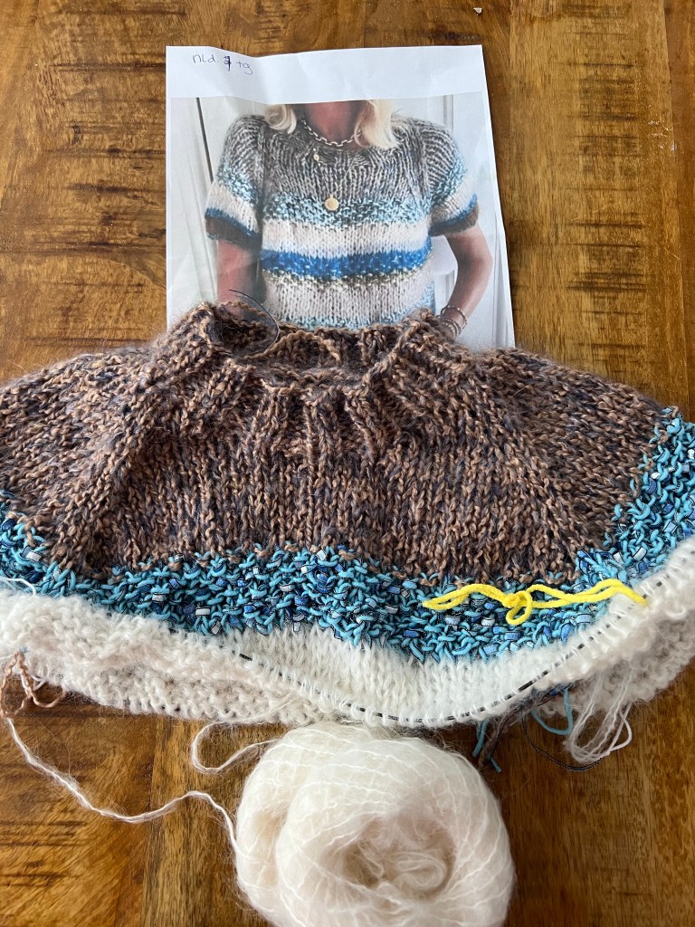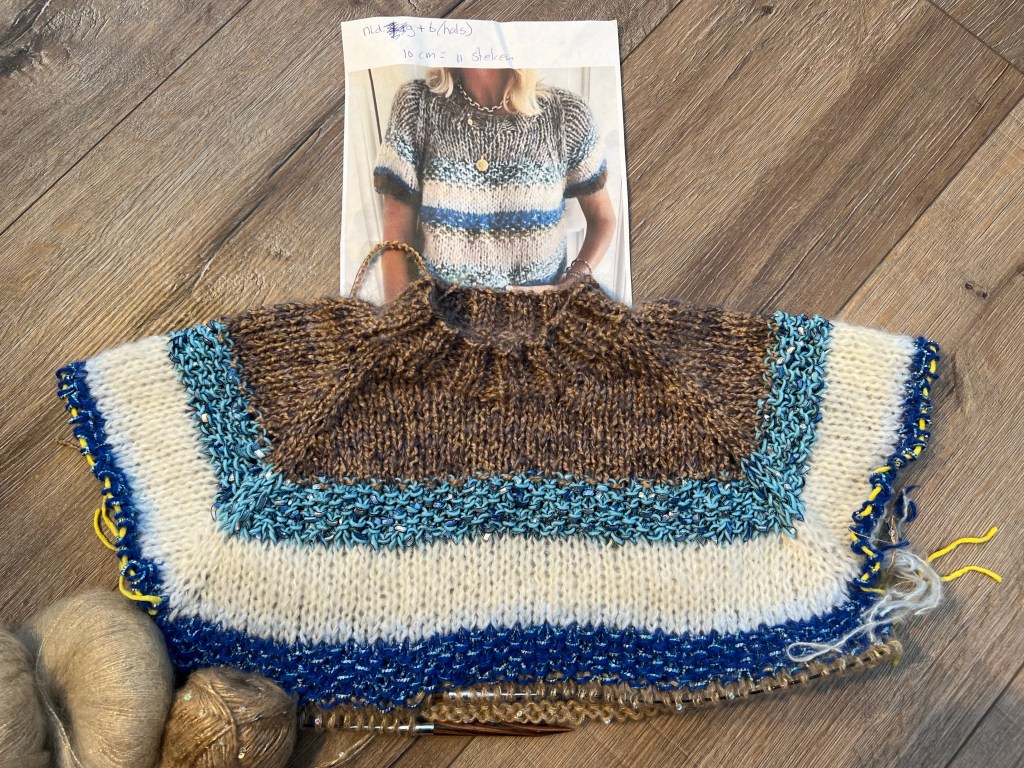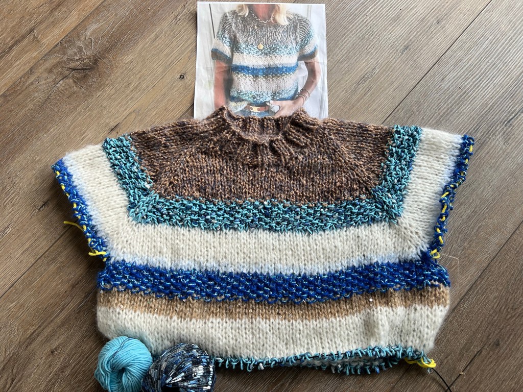 Het truitje was duidelijk Top-down gebreid met een iets verlaagde hals. Dus snel een proeflapje gebreid met het garen waar ik het truitje mee wilde beginnen en direct van start gegaan.