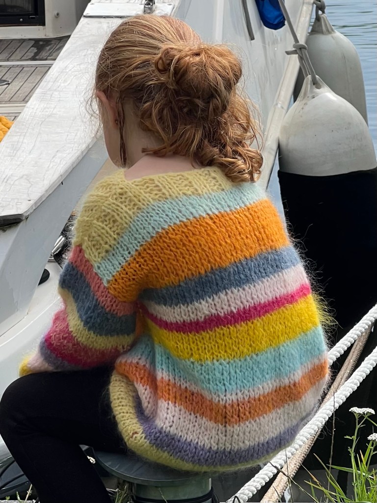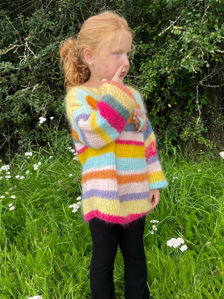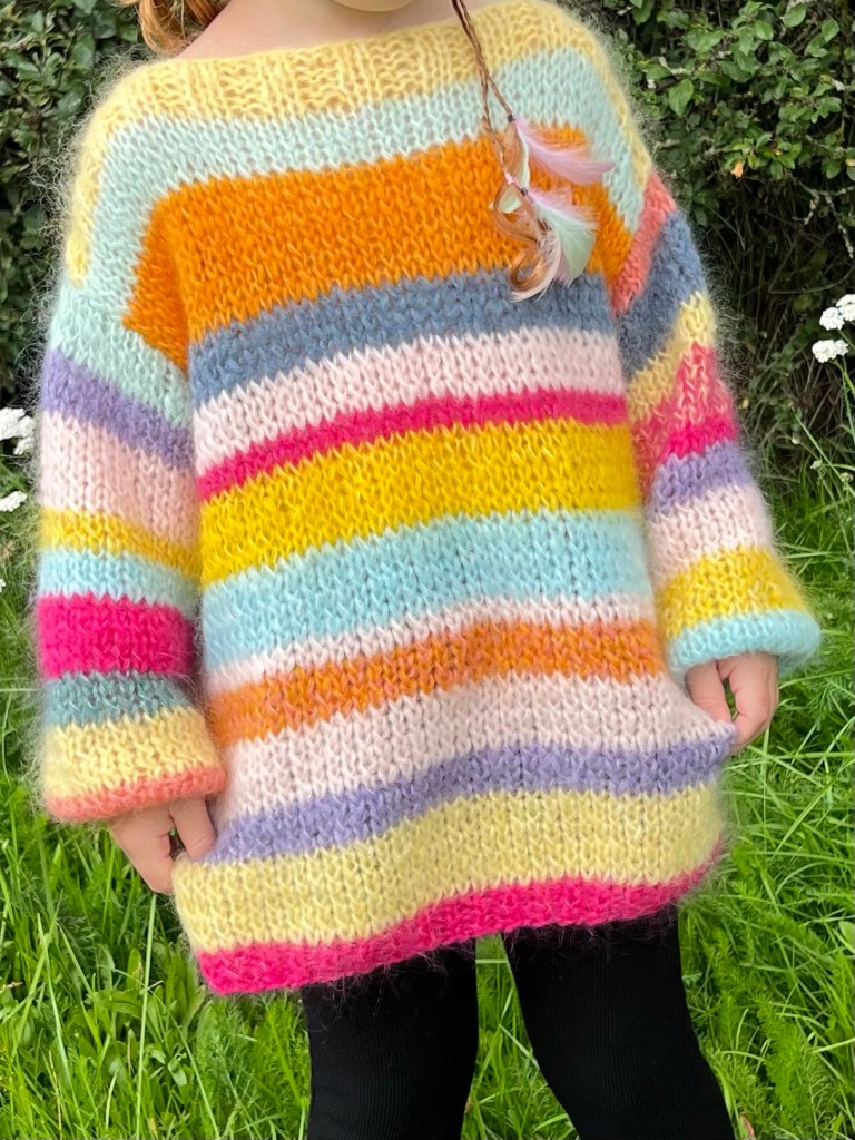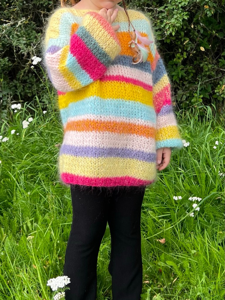 Deze fleurige regenboogtrui is gebreid in 4 aparte delen op breipen 8. De boordjes aan de mouwen en de panden zijn gebreid op breipen 6. Het is echt een super simpel patroon! Het enige wat je nodig hebt is een berg restjes garen 🙂