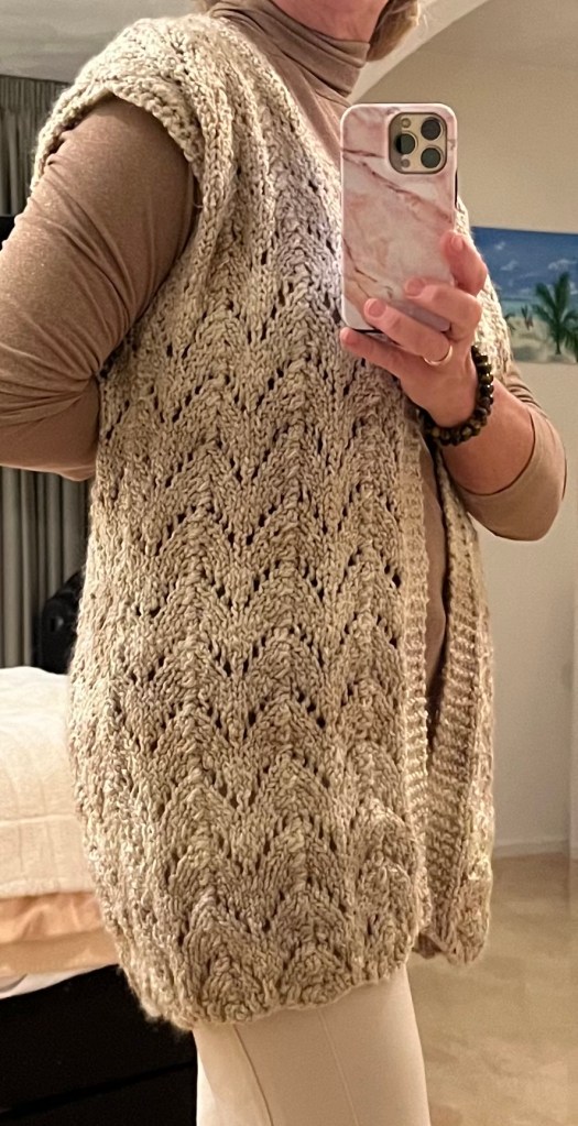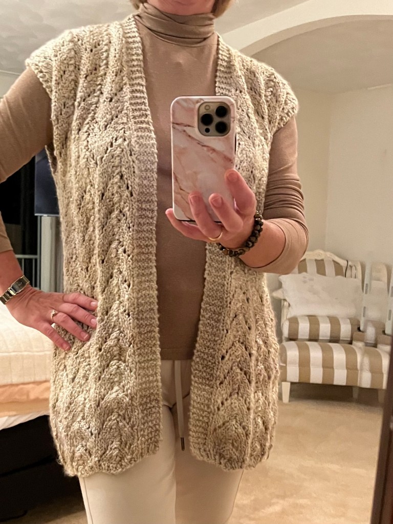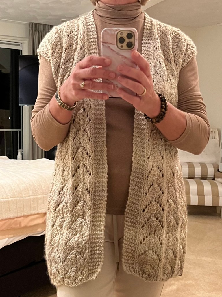 Een mouwloos vest geeft net even dat kleine beetje warmte wat we nu nodig hebben. Heerlijk voor over een blouse of longsleeve. Geen mouwen dus even snel breien 🙂
