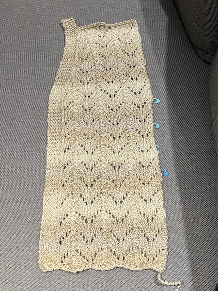 Bij 73 cm totale hoogte voor de schouders aan beide kanten van het werk 1 x 13 en 1 x 12 steken afkanten. Aansluitend de resterende steken afkanten.