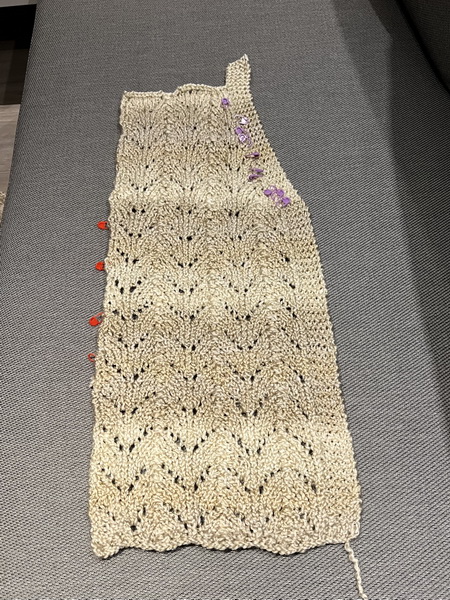 1e meerdering bij 38 cm hoogte: Aan beide kanten van het werk 1 meerdering maken door een lus op te nemen tussen 2 steken in en deze lus gedraaid recht te breien.