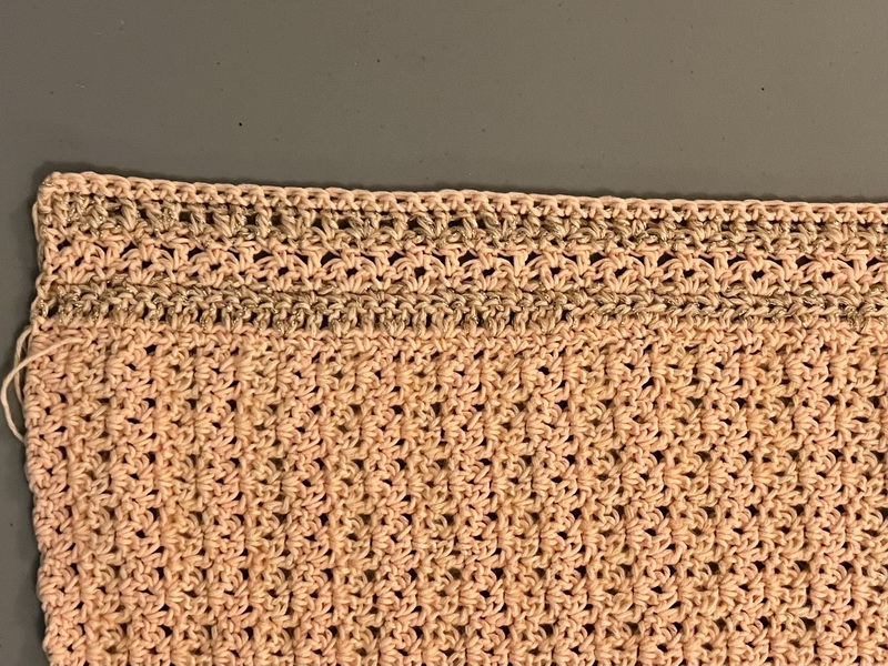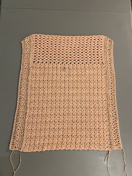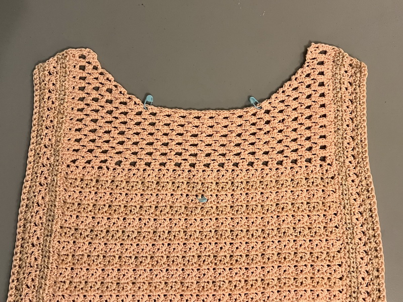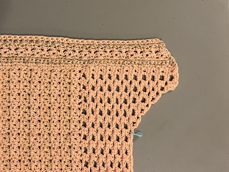Hecht een nieuwe draad aan, aan de andere kant van de hals bij de steken markeerder en haak daar een kant stokje in een losse boog. Vervolgens 2 HST in de volgende lossen boog en verder volgens het patroon. De heengaande toer naar de hals toe eindigen met 1 V in de laatste lossen boog. Deze 2 toeren nog 3 x herhalen en daarna verder haken in het patroon zonder te minderen tot dezelfde hoogte als die van het rugpand is bereikt. Bij mij waren dat nog slechts 2 toeren.