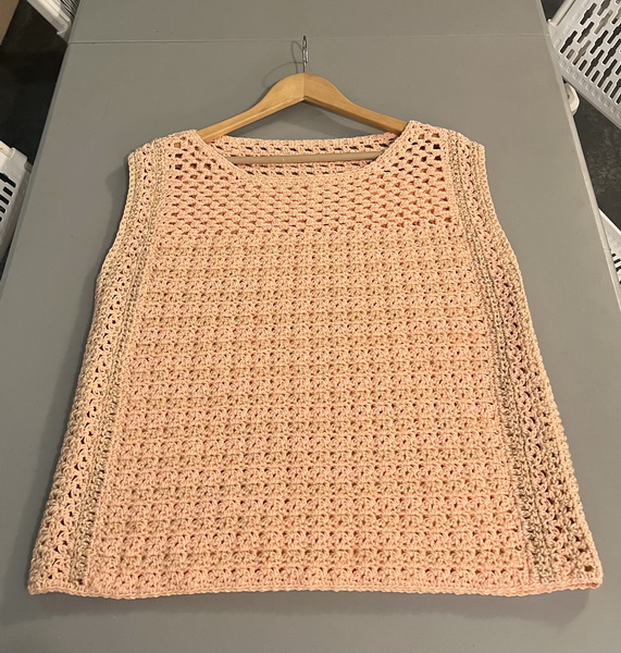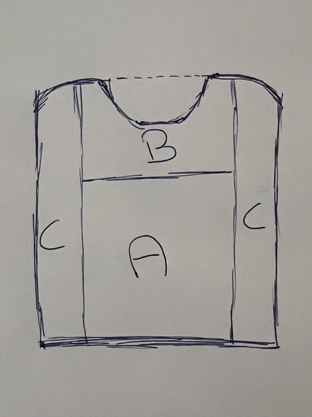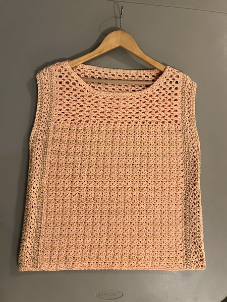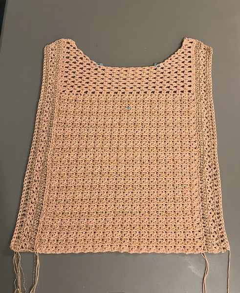 Afwerking: Zet de schouders aan elkaar, maak de zijnaden dicht en laat hierbij 22 cm open voor het armsgat.