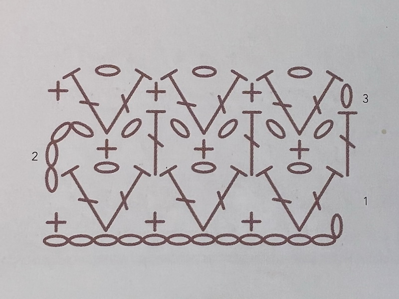 Toer 3: 1L, *1 steek overslaan, (1ST, 1L, 1ST) in de volgende steek, 1 steek overslaan, 1V in de volgende steek*, ** herhalen en eindigen met 1V.