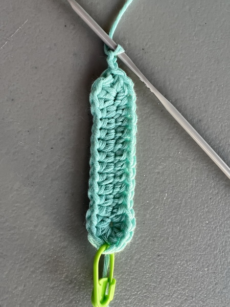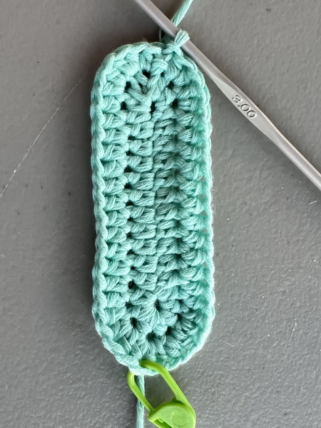 Toer 1: Haak 3 HST in de 3e losse, haak 10 HST, haak 7 HST in de laatste losse (plaats een steken marker in de middelste steek van deze 7 steken, dit is midden voor), haak aan de andere kant van de lossen verder, haak 10 HST, haak 3 HST in de laatste steek, haak nog 1 HST in de 1e steek en sluit de toer met een SLST in de 1e steek van deze toer.