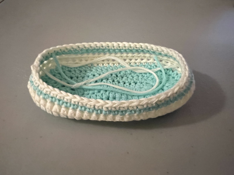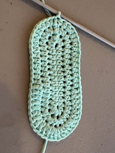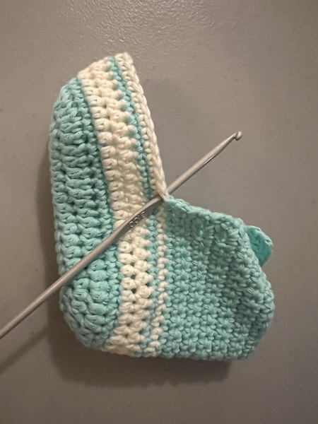 Haak 2 zooltjes en leg ze daarna met de verkeerde kanten tegen elkaar aan. Haak de zooltjes aan elkaar met een toer vasten met mint groen. Haak vervolgens 2 toeren HST met crĆØme, 1 toer V met mint groen en nog een toer V met crĆØme.