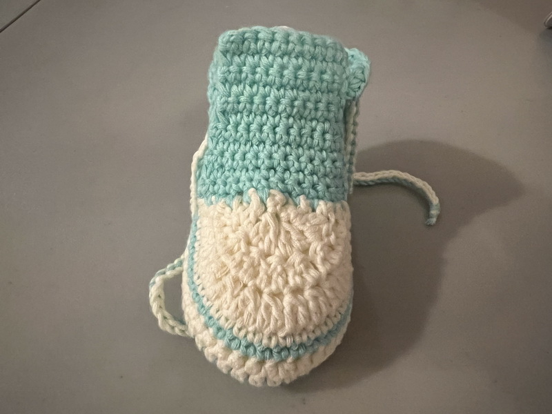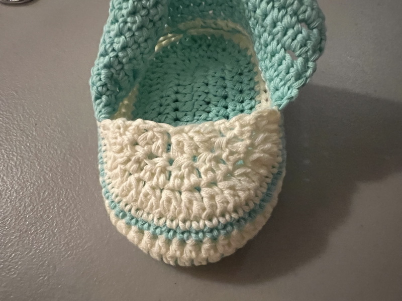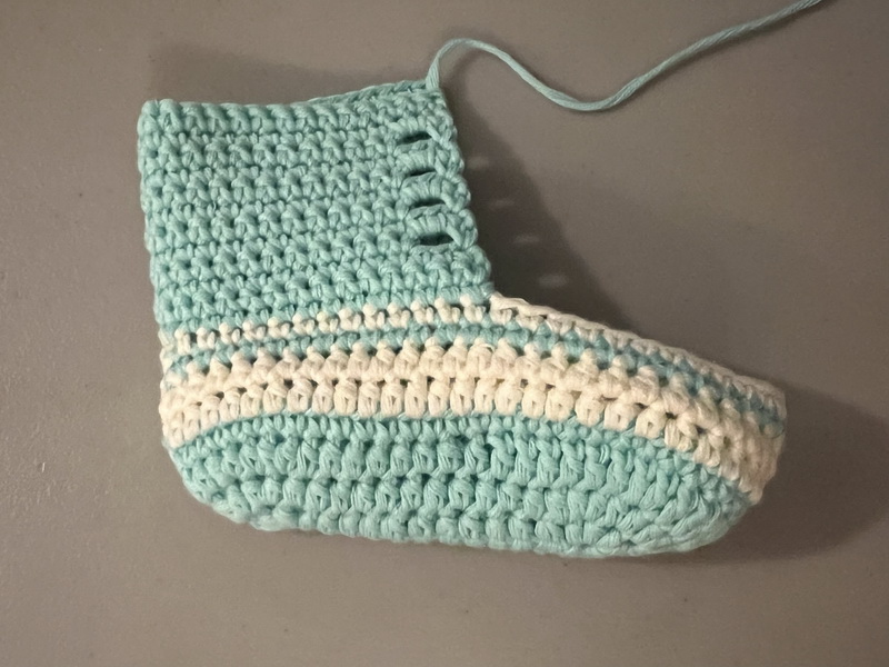 De achterkant van het schoentje: Tel nu vanaf middenachter 15 steken terug en hecht daar een nieuwe draad aan met mint groen. Haak 30 vasten, keren en nog 2 toeren vasten haken (begin telkens met 1 L). Toer 4: keren, 1 L, 1 V, 2 L, 2 steken overslaan en verder vasten haken tot 3 steken voor het einde. Haak 2 L, sla 2 steken over en nog 1 V in de laatste steek. Toer 5: keren, 1 L, 1 V, 2 V om de 2 lossen van de vorige toer en de toer verder haken tot de 2 lossen van de vorige toer en ook daar 2 V omheen haken en eindigen met 1 V in de laatste steek. Er is nu 1 āknoopsgatā ontstaan waar straks de veter doorheen geregen wordt. Haak op deze manier nog 3 āknoopsgatenā. Daarna nog 1 toer vasten en de draad afknippen en wegwerken.