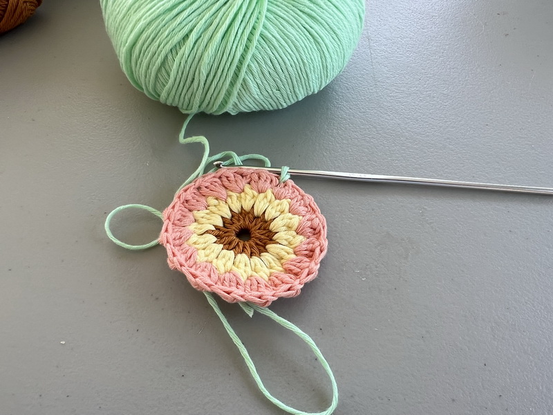 – Hecht een nieuwe kleur aan (mint groen) tussen 2 bolletjes van de vorige toer. Haak 2 lossen en 2 stokjes samen tussen dezelfde 2 bolletjes, gevolgd door 1 losse. Tussen de volgende 2 bolletjes haak je (3 dubbele stokjes samen, 3 lossen, 3 dubbele stokjes samen). Dit is de 1e hoek. Nu 3 x tussen de volgende bolletjes 3 stokjes samen haken, haak een hoek, haak 3 x 3 stokjes samen tussen de volgende bolletjes, haak hoek no 3, haak 3 x 3 stokjes samen tussen de volgende bolletjes, haak de laatste hoek, haak nog 2 x 3 stokjes samen tussen de bolletjes. Sluit deze toer met een halve vaste in de 2e losse van het begin. Knip de draad door.