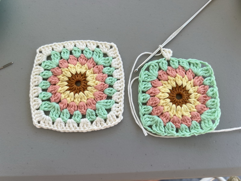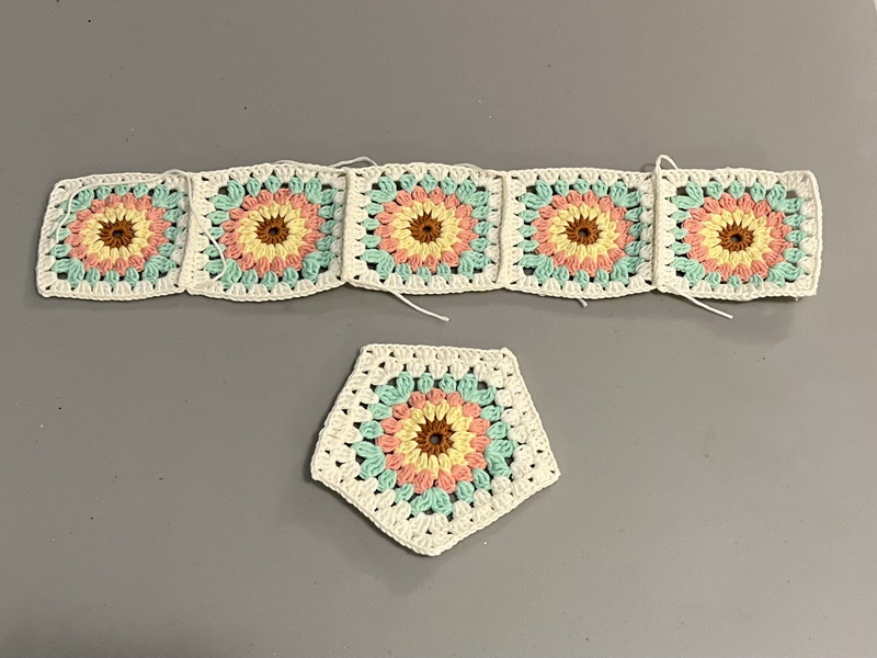 Ik heb de rij met de 5 Grannies ook gewoon met een toer vasten vastgehaakt aan de ābodemā Granny met 5 kanten.