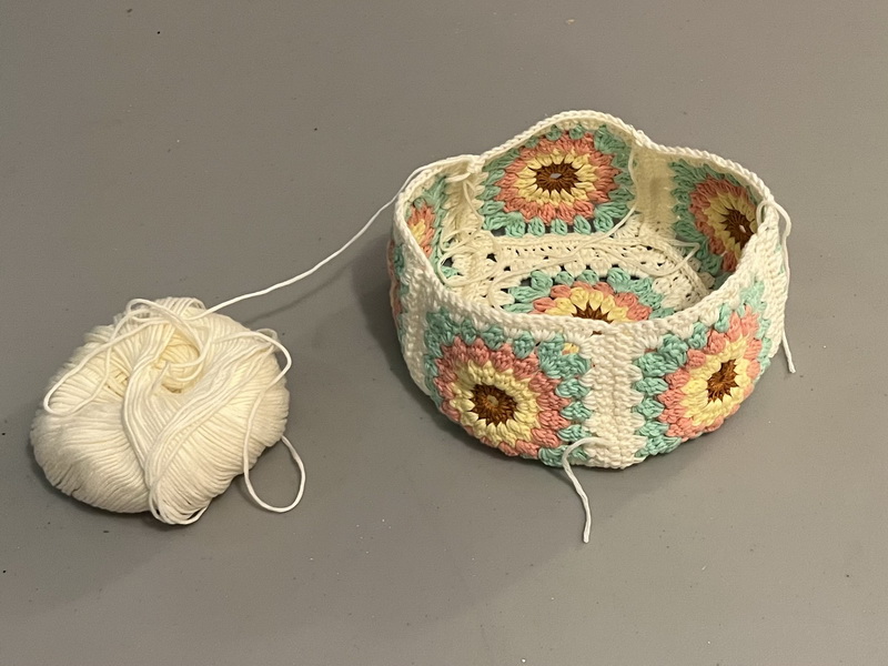 In de hoogte haken: Om het tasje wat hoger te maken heb ik nog een aantal toeren in het rond gehaakt. Elke toer wordt gesloten met een halve vaste en weer begonnen met 2 lossen. Tussen alle bolletjes en in elke hoek (de hoeken van de 5 Grannies) heb ik 3 stokjes gehaakt. In de volgende toeren haak je telkens 3 stokjes tussen 2 groepjes van 3 stokjes in. Ik heb nog 2 toeren met creme, 1 toer mint groen, 2 toeren creme, 1 toer zalm, 1 toer geel, 1 toer bruin, 1 toer creme, 1 toer mint groen, 1 toer creme en als laatste nog 1 toer picots.