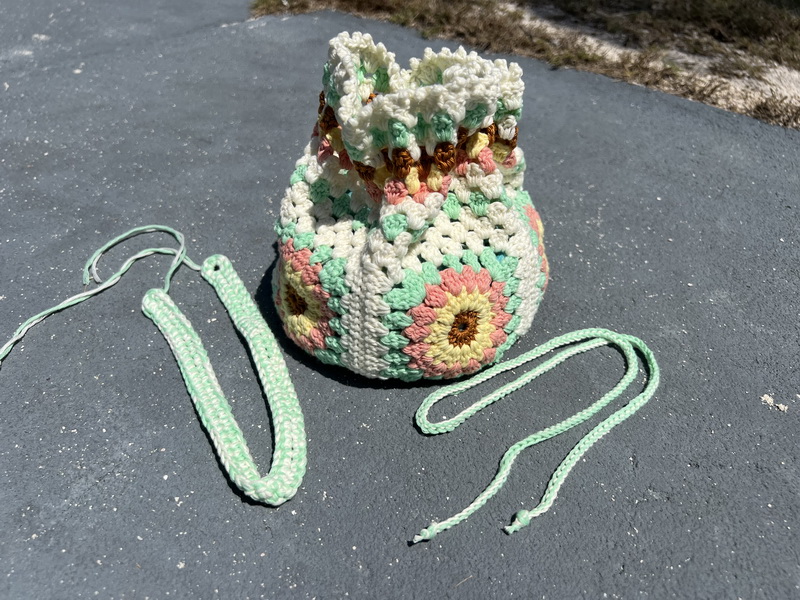 Hengsel: Ik ben begonnen met een lossen sliert van 66 lossen met een dubbele draad (1 creme en 1 mint groen). In de 2e losse heb ik 3 vasten gehaakt, verder in elke losse 1 vaste. In de laatste losse heb ik 5 vasten gehaakt, langs de andere kant van de lossen terug haken en in elke steek 1 vaste haken. In de laatste (eerste) steek nog 2 vasten. Sluit met een halve vaste en knip de draad door.