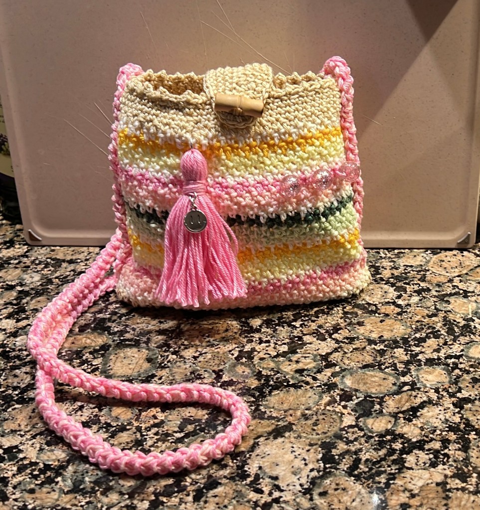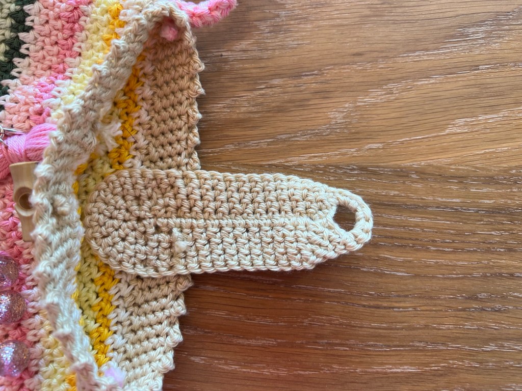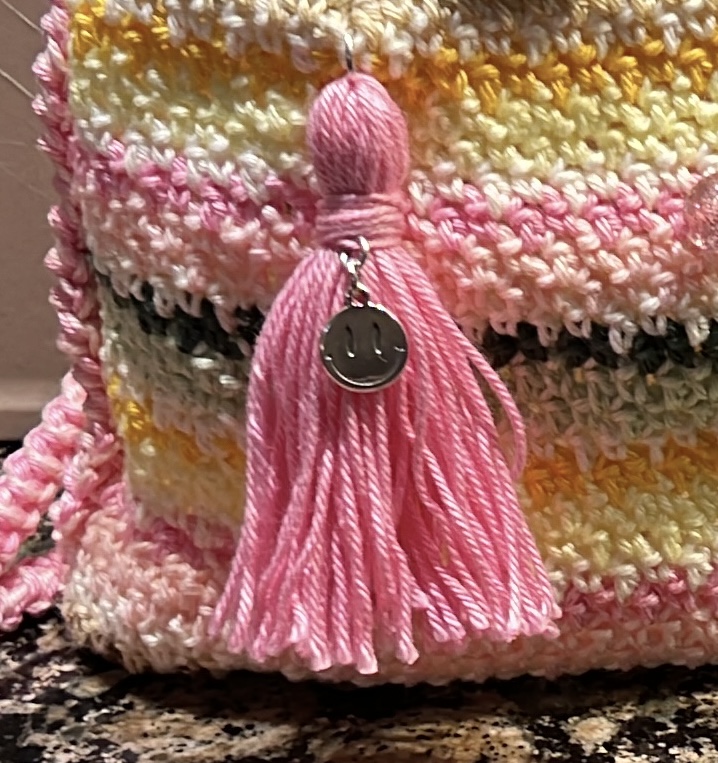 Maak een tassel en zet deze aan het tasje vast op een willekeurige plek. Ik heb ook nog 3 glitter knoopjes op het tasje vastgezet en een soort sluiting gehaakt.