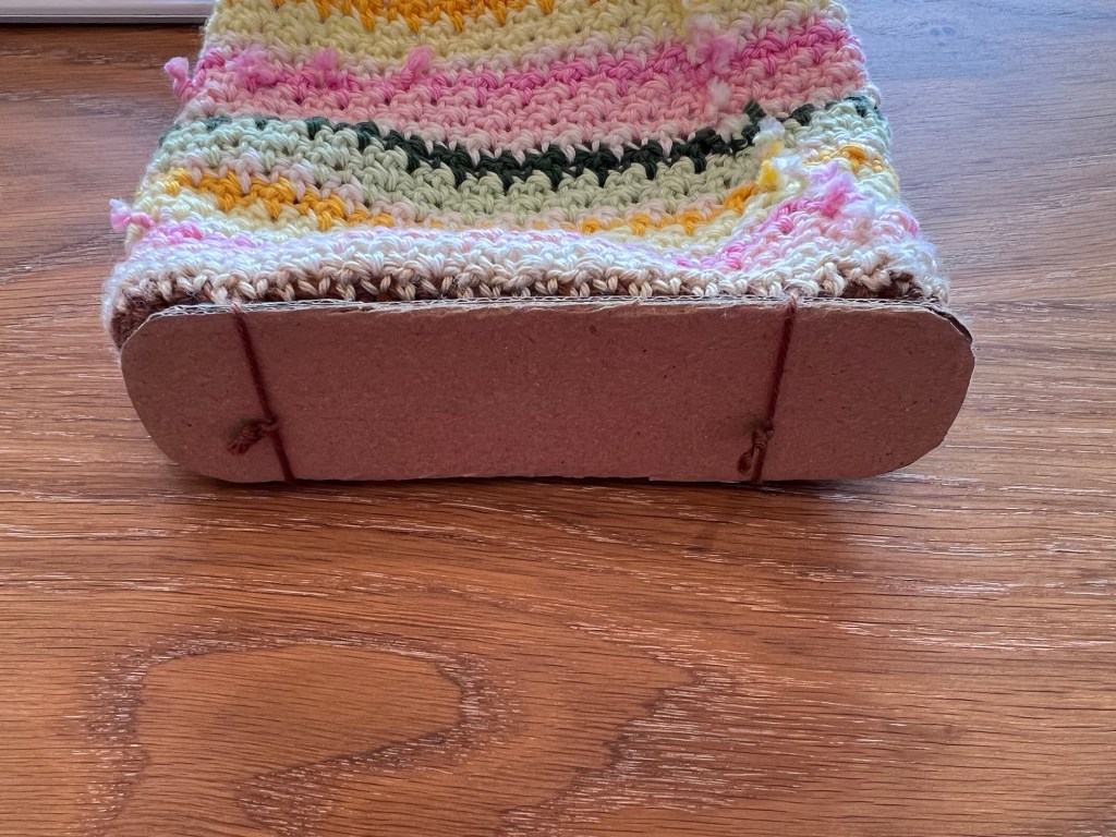Als je tasje hoog genoeg is haak je nog 3 toeren vasten en 1 toer kreeften steek. Haak een lang koord en zet deze vanaf de bodem langs de zijkanten vast.