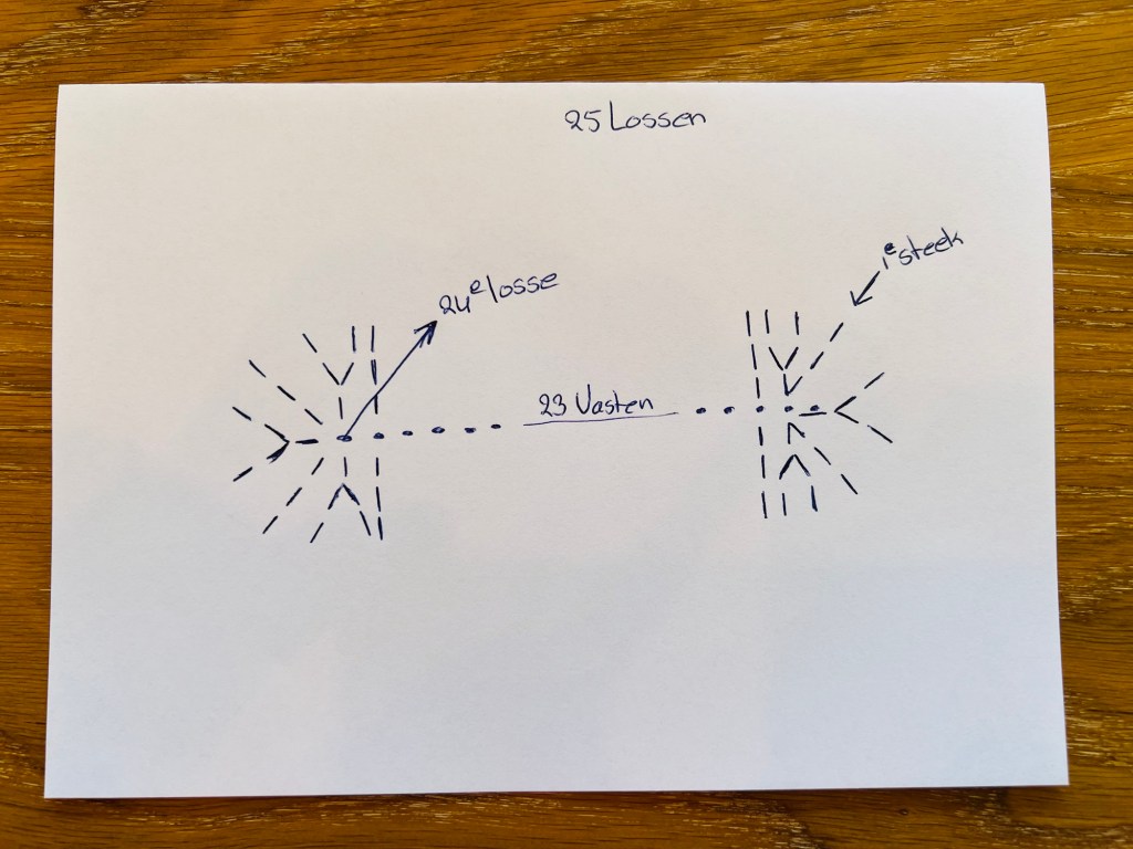 Elke toer word begonnen met 1 L en wordt geƫindigd met 1 halve V in de 1e steek.