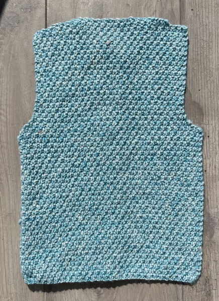 62 steken opzetten met breinaald 7. Brei dubbele gerstekorrel steek tot een hoogte van 32 cm. Voor de armsgaten 1 x 3 en 2 x 1 steek afkanten. Als het armsgat 22 cm hoog is voor de schouders 1 x 6 en 1 x 5 steken afkanten. Daarna de resterende steken afkanten.