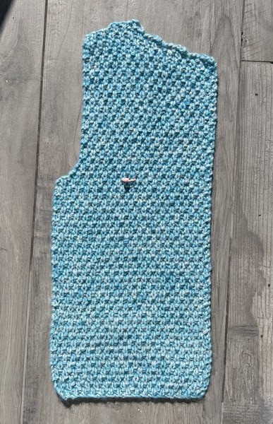 29 steken opgezetten met breinaald 7. Brei in dubbele gerstekorrel steek. Meerder aan beide zijden elke 3 cm , 10 x 1 steek. Dus bij 3, 6, 9, 12, 15, 18, 21, 24, 27 en 30 cm. Bij 36 cm totale hoogte voor het armsgat aan beide kanten 1 x 3 en 2 x 1 steek afkanten. Vervolgens elke heengaande toer aan beide kanten 2 steken samen breien (Voor en na de kantsteek). Aan het begin van de toer brei je 2 steken samen na de kantsteek en aan het einde van de toer haal je 1 steek af, brei je 1 steek en haal je de afgehaalde steek over de gebreide steek, daarna nog de kantsteek breien. Als er nog 19 steken over zijn, aan beide kanten nog 2 x 3 steken afkanten en vervolgens de laatste 7 steken afkanten. Brei nog een mouw.
