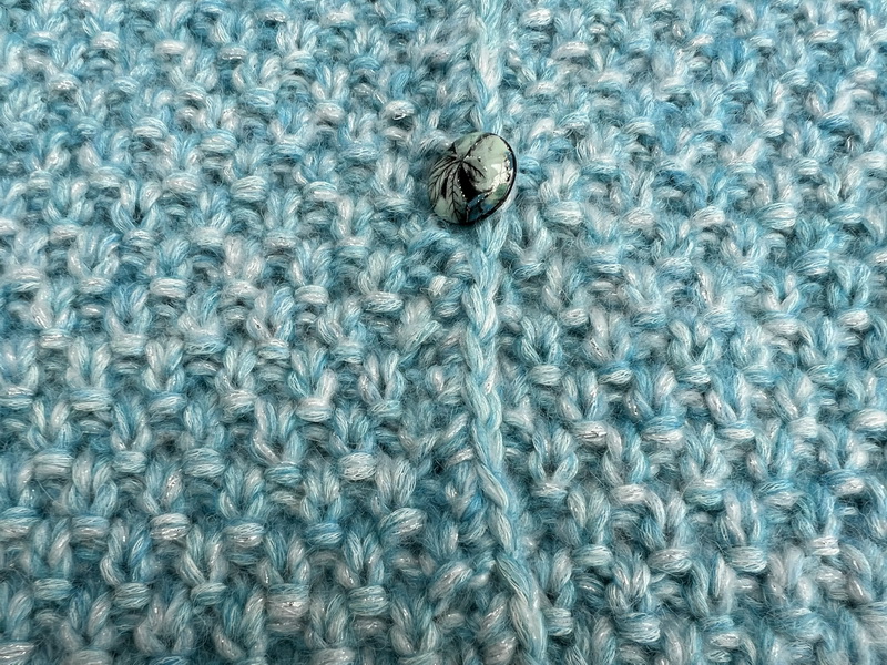 Verdeel op het linker voorpand de knopen en zet ze vast. Haak langs het rechter voorpand een toer Losse/Vaste met op de plekken waar de knopen zitten telkens 2 lossen i.p.v. 1.
