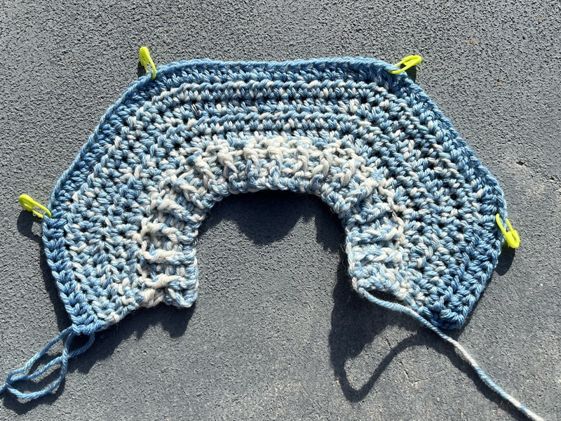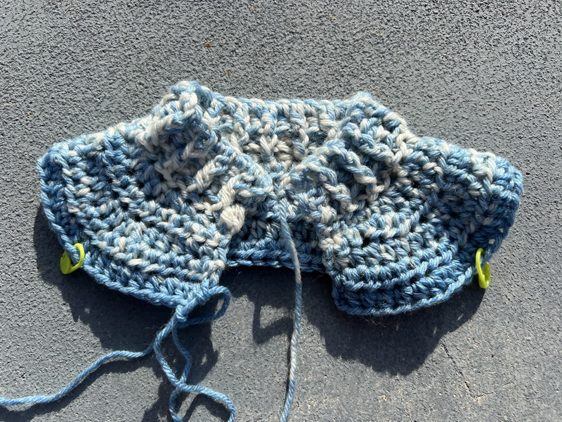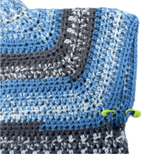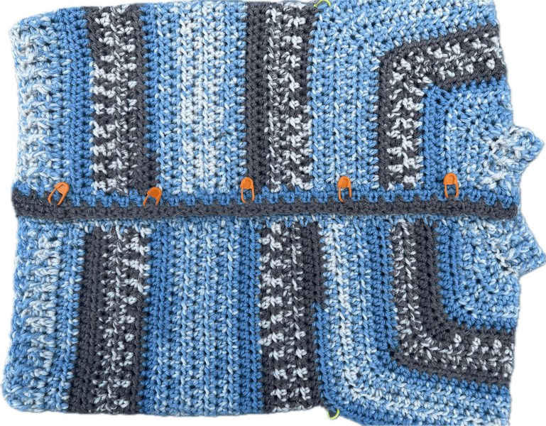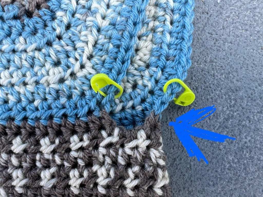 Mouw: Hecht een nieuwe draad aan in de steek VOOR de steken marker. Bij mij was dat in een grijze steek waar de blauwe pijl zit (zie foto). DE achterste grijze steek. (je kunt ervoor kiezen om met een bepaald deel/kleur van de draad te beginnen, ik heb voor grijs gekozen omdat het dan enigsinds mooi doorloopt ten opzichte van het voor -en rugpand) Haak 2 lossen en vervolgens een slipstitch in de voorste grijze steek. Je hebt nu 2 steken extra gemaakt in de oksel, net als tussen de voorpanden en het rugpand. Hier begint nu je 1e toer van de mouw. Haak 2 lossen en een half stokje in dezelfde steek. Haak halve stokjes tot je weer bij de 1e steek bent (totaal 41 halve stokjes) en sluit de toer niet maar haak gewoon verder in het rond met halve stokjes. LET OP! In elke 3e toer ga je links en rechts van de oksel 2 halve stokjes samen haken. (2 steken minderen dus). Zodra de mouw een binnenmaat (van oksel tot pols) heeft van 23 cm, haak je eerst 1 toer stokjes en vervolgens haak je nog 2 toeren relief stokjes / boordsteek voor het boordje.