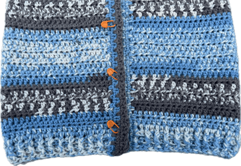 Hecht een nieuwe draad aan aan het andere voorpand en haak ook hier langs het pand 4 toeren Lossen / Vasten patroon. LET OP! In de 4e toer worden ook de knoopsgaten gehaakt.