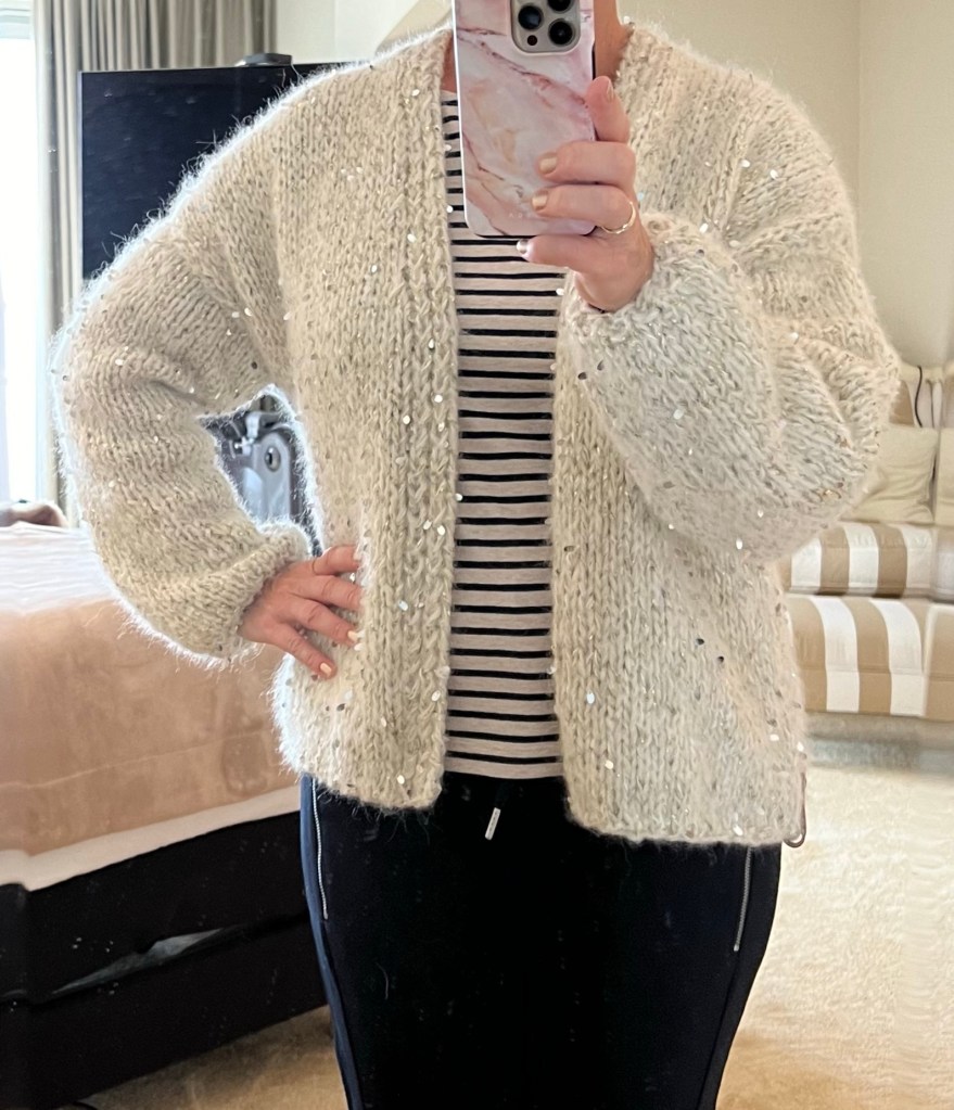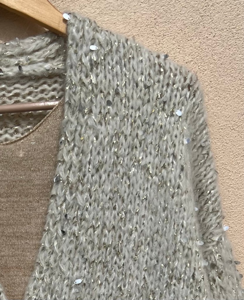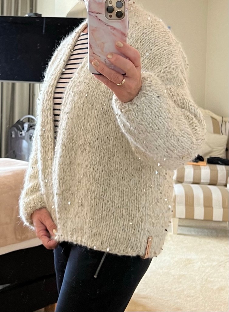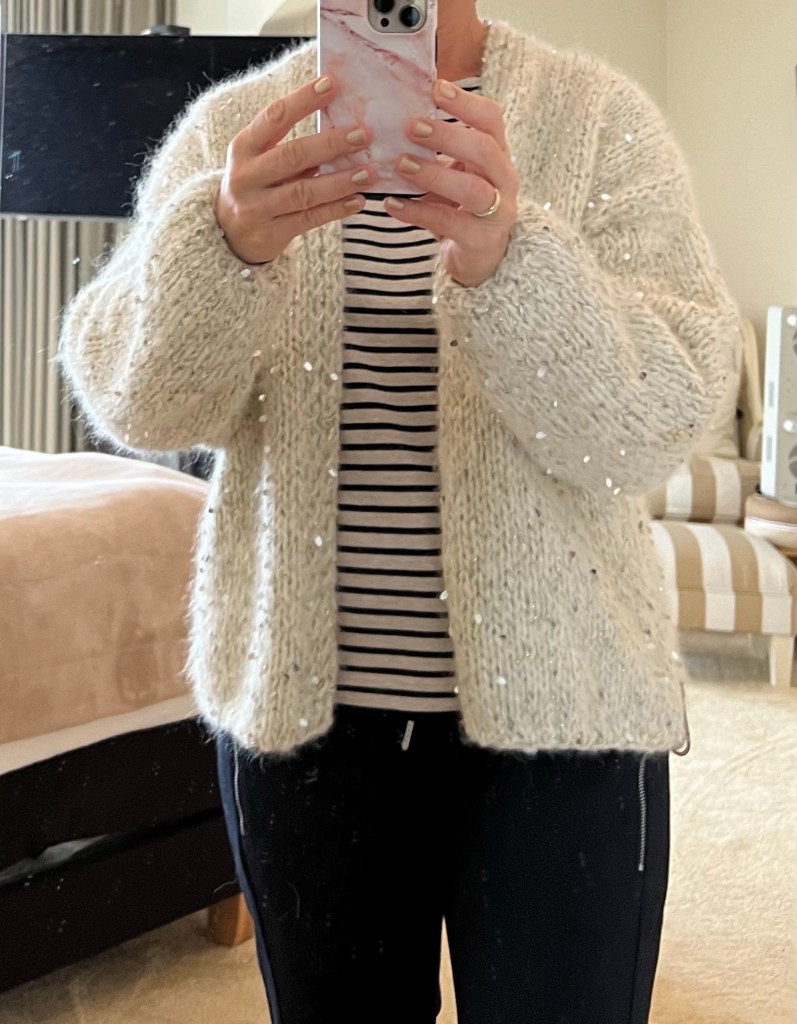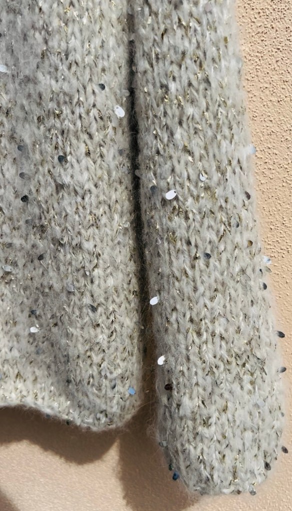 Mouw: Zet 23 steken op met breinaald 9. Ga verder met breinaalden 10 en brei 2 toeren boordsteek. Brei verder in Tricotsteek en meerder in de eerste toer verdeeld 10 steken (33 steken). Meerder ook elke 7 cm hoogte aan beide kanten 1 steek door een lus op te nemen tussen 2 steken en deze gedraaid recht te breien. Ik heb dat op 2 steken vanaf de beide kanten gedaan. Er wordt op deze manier 6 x gemeerderd. Er zijn daarna 45 steken op de naald. Als de mouw 46 cm lang is (of jou gewenste mouwlengte), alle steken losjes afkanten. Brei nog een mouw.