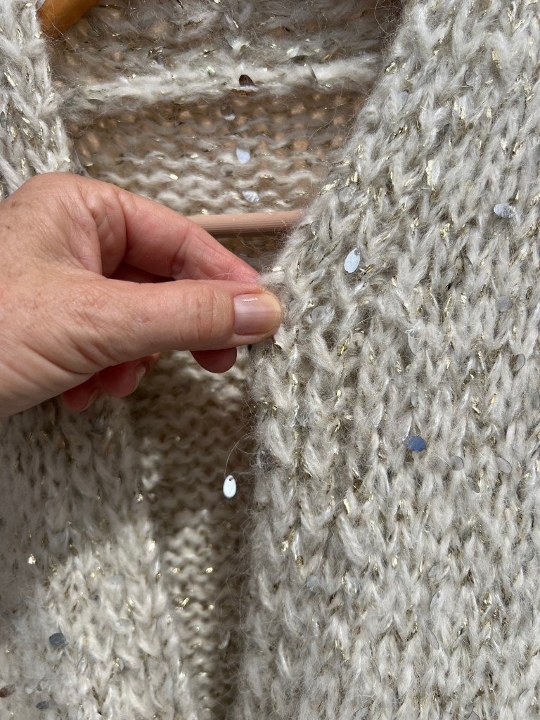 Brei het andere voorpand in spiegelbeeld. De 4 steken die geminderd worden voor de schuining naar de hals worden gedraaid recht samengebreid.