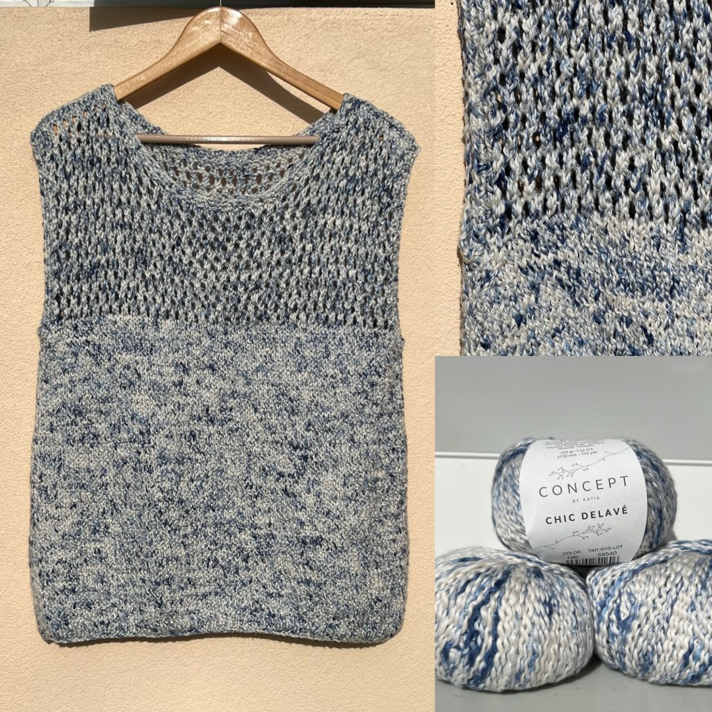 Wat een heerlijk zacht garen 🧶 is dit. En lekker soepel vallend ook. Chic Delave van Katia bestaat voornamelijk uit katoen, maar er zit een zilver glimmertje in dus ook wat Polyester. Het is een zeer losse draad welke gemakkelijk pluist en uit elkaar valt, dus niet geschikt om veel uit te halen hi hi. In 1 keer goed breien dus! 😁
