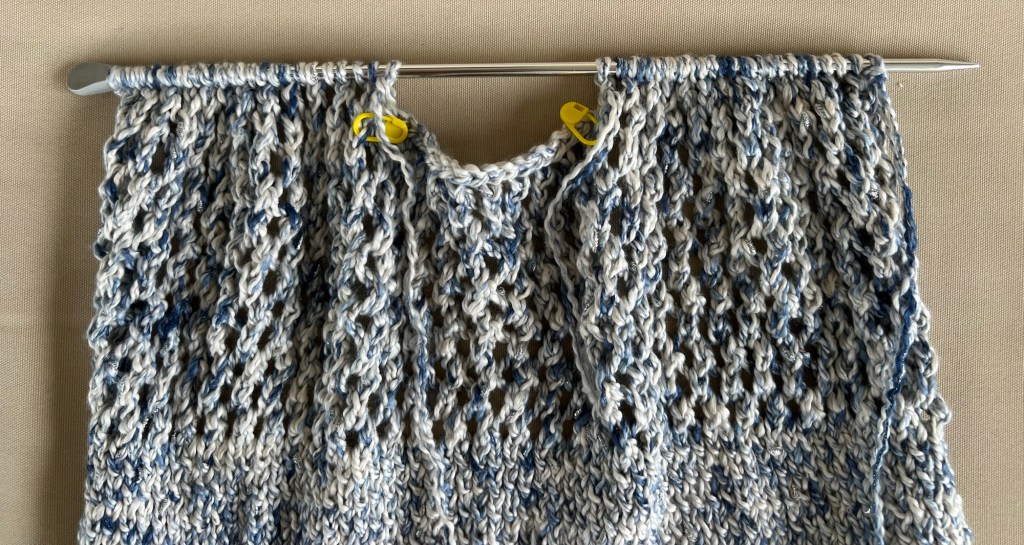 Na de minderingen voor de armsgaten verder breien in Gaatjes patroon.
