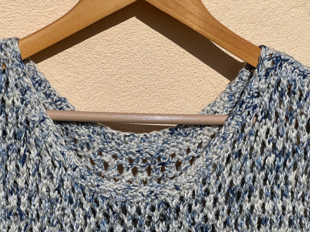 Afwerking: Schoudernaden sluiten en zijnaden sluiten. Ik heb hiervoor een witte katoenen draad gebruikt, omdat de draad, Chic Delave, heel snel split en pluist. Langs de hals en de armsgaten heb ik 2 toeren lossen, vasten patroon gehaakt met haaknaald 4