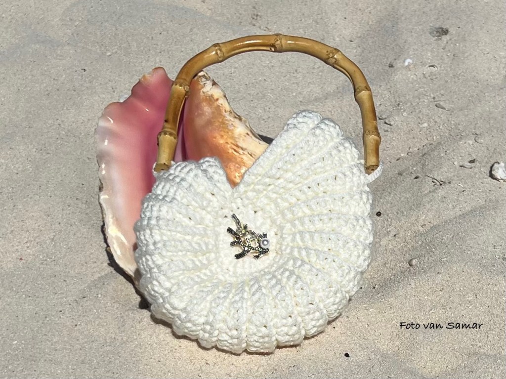 Ik heb houten handvaten gekocht en deze aan het tasje vastgezet met hetzelfde draad/garen. Je zou ook zelf een hengsel kunnen haken en deze aan het tasje vastmaken. Ik heb in het midden op de schelp een mooie broche geplaatst. Je zou ook nog pareltjes erop kunnen naaien. Gewoon lekker pimpen zoals je dat zelf leuk vind.