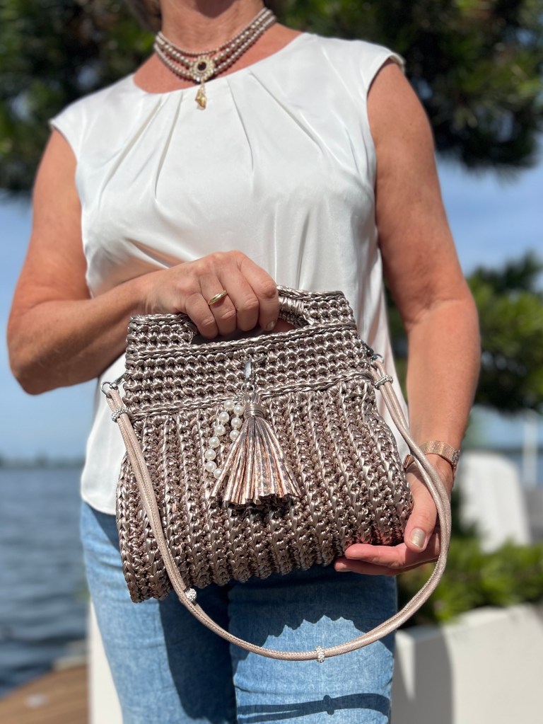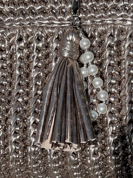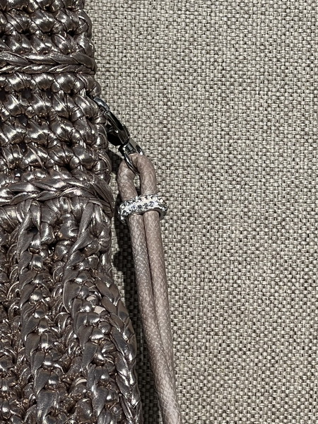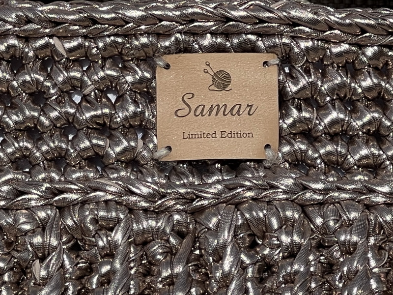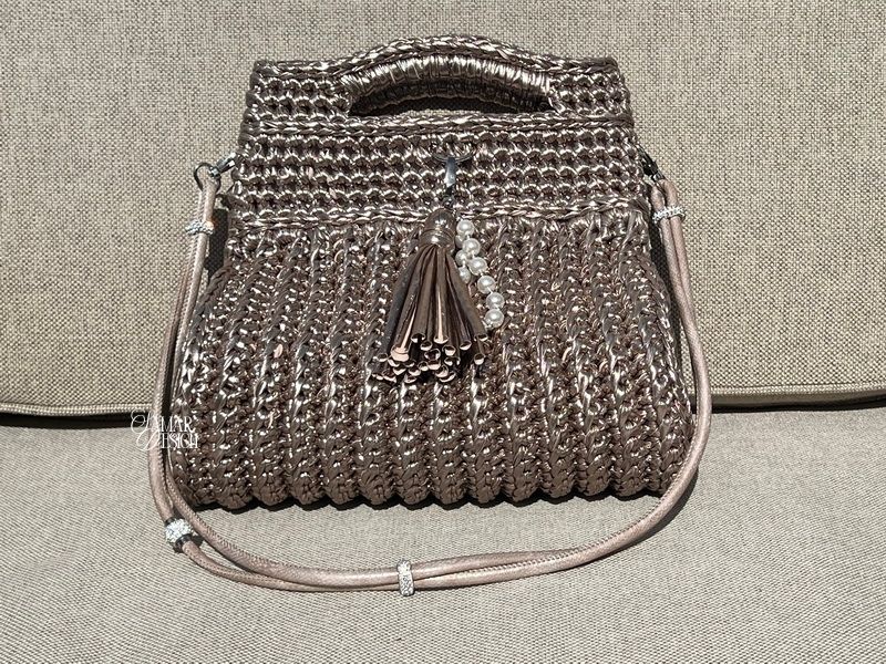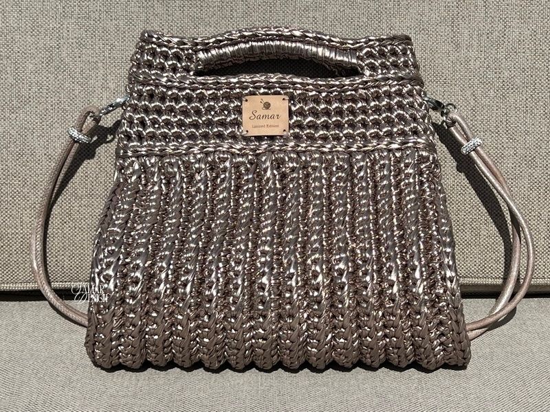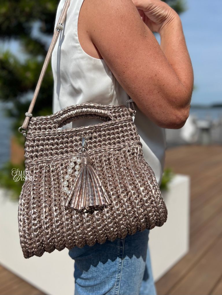 Deze unieke handgemaakte tas straalt pure elegantie uit. Gehaakt met speciaal metallic garen dat de uitstraling heeft van leer, maar tegelijkertijd licht en soepel is. Een echte eyecatcher voor wie houdt van klasse en originaliteit.